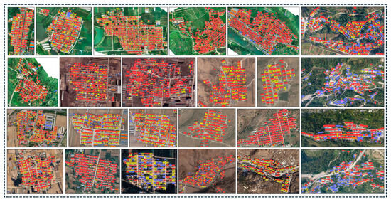 To assess the transferability of the trained model, this study selected 24 typical villages from five traditional village spatial style areas in Shandong Province as test samples, referring to the style types and regional divisions of traditional villages in Shandong [65]. The selection of test sample villages took into account factors such as style features, village area, settlement morphology, preservation status, altitude, topography, and landforms, ensuring that the test samples cover all types of architectural characteristics of traditional villages in Shandong Province. A total of 57,738 validation data points were obtained (Figure 8). The test results were compared with actual data, as shown in Table 3. The model achieved high recognition accuracy for damaged buildings, flat-roofed buildings, red-tiled roof buildings, and gray-tiled roof buildings, all above 95%, with the recognition accuracy for red-tiled roof buildings reaching 97.1%. The recognition accuracy for abandoned buildings and buildings with colored steel tile roofs was relatively lower; the accuracy for abandoned buildings was 91.3%, mainly because the primary identification feature for abandoned buildings is the vegetation coverage in the courtyards, which can be easily misidentified due to the large area and high density of vegetation in public spaces and green areas within the villages. The recognition accuracy for buildings with colored steel tile roofs was 86.7%. Combining field research, the relatively low accuracy is attributed to some colored steel tiles exhibiting features similar to red tiles due to rust. On the other hand, some buildings have adopted colored steel tiles that imitate the gray roof style to protect the traditional village appearance, which also increases the difficulty of identification. Considering the limitations of the actual collected data and the diversity of architectural characteristics in traditional villages, the trained model demonstrates high accuracy in identifying key features such as roofs and courtyard vegetation coverage, meeting the requirements for practical work such as the investigation, evaluation, and dynamic monitoring of changes in traditional village buildings within the Shandong Province.