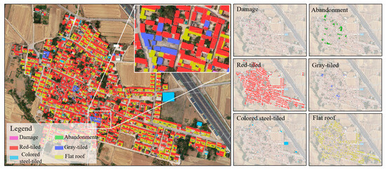 Inputting the UAV images from 2020 and 2024 into the deep learning model, this study extracts the building condition features from the two periods of village images (Figure 11 and Figure 12) and compares the changes in the data between the two periods. The results (Table 4) indicate that compared to 2020, in 2024, the number of damaged buildings in the village decreased from 31 to 15; the number of abandoned buildings decreased from 30 to 26; the number of red tile roofs decreased from 1343 to 1297; the number of gray tile roofs increased from 17 to 36; the number of colored steel tile roofs decreased from 44 to 24; and the number of flat-roofed buildings decreased from 1222 to 1200.