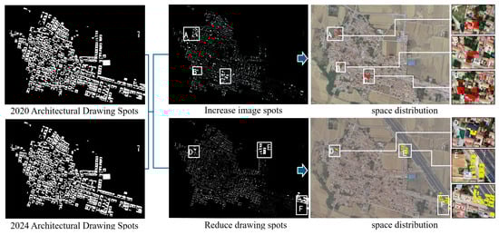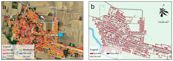 Based on the extracted data, a differential analysis was conducted on the building condition patches from the two periods (Figure 13). By combining manual discrimination to eliminate recognition errors, a transition matrix of building condition changes was constructed (Table 5), which analyzes the interconversion relationships between different types of building conditions. Specifically, four abandoned buildings were transformed into gray-tiled buildings; seven damaged buildings were changed into red-tiled buildings, and nine into gray-tiled buildings; five red-tiled buildings were converted into gray-tiled buildings, and 27 were demolished; 12 colored steel tile-roofed buildings were demolished, and four were changed into red-tiled buildings; 30 flat-roofed buildings were demolished; and three new gray-tiled buildings were constructed.