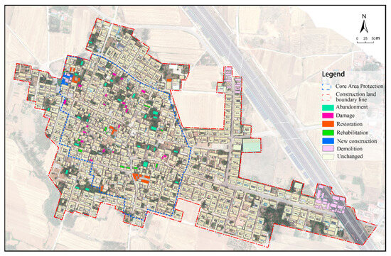 In accordance with the definitions of traditional village building conditions and their forms of change, as described earlier, the data from the building condition change transition matrix were further transformed and categorized into types such as abandonment, damage, restoration, rehabilitation, new construction, demolition, and remaining unchanged, to obtain dynamic monitoring indicator data for building condition changes (Table 6). Specifically, there were 18 restored buildings, including the restoration of nine originally damaged buildings, four originally abandoned buildings, and the traditional-style restoration of five originally red-tiled buildings; 11 rehabilitated buildings, comprising the rehabilitation of seven damaged buildings and four colored steel tile-roofed buildings; three newly built traditional-style buildings; 69 demolished buildings, all of which were of modern style; and 2527 unchanged buildings. The dynamic monitoring results of building condition changes from 2020 to 2024 are shown in Figure 14.
