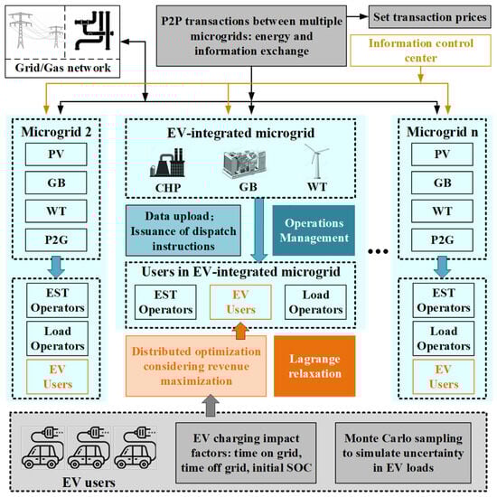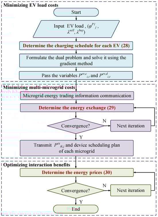 - A multi-microgrid interaction strategy is proposed to simplify the solving process, transforming the energy-sharing and -trading problem into the following three solvable subproblems: minimizing EV load costs, minimizing multi-microgrid costs, and optimizing the distribution of interaction benefits.