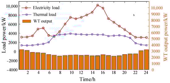 - Electrical Power Balance Constraintswhere Le,j is the electrical load of the microgrid at time j; is the net power of energy interaction between the EV-integrated microgrid and other microgrids at time j; , , and are the actual power outputs of WT, CHP, and ESS at time j, respectively; is the change in electrical load due to the IDR mechanism at time j; and is the net power of energy interaction between the EV-integrated microgrid and the grid at time j.
