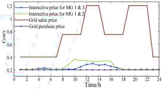 - Optimizing the distribution of interaction benefitswhere is value of the Lagrange multipliers for the third subproblem at time j; is the penalty factor for the third subproblem at time j; and is the price of interaction power between microgrid i and microgrid k at time j, i ≠ k.