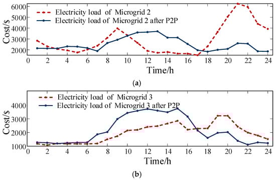 - Case 5: The EVs within the microgrid adopt an orderly charging mode with consideration of P2P transactions between microgrids and DR.
