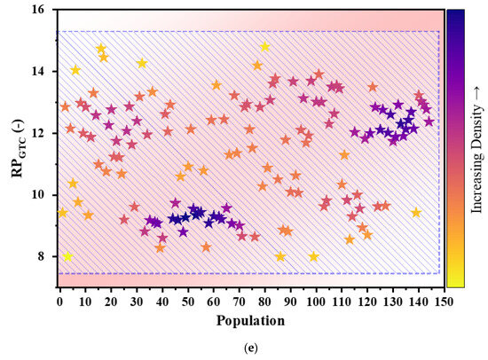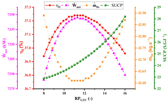 Figure 2 shows the complex interaction between RPGTC and four key variables: , , , and SUCP. Notably, the green curve illustrating the connection between RPGTC and SUCP demonstrates a gradual upward pattern from its starting point; this patter occurs because, as the value of RPGTC increases, the turbine and compressor have a more complex structure, which increases the price. Interestingly, the lowest point of SUCP is seen at RPGTC = 8, while the highest is reached at RPGTC = 16. Simultaneously, another curve is used to show how behaves with changes in RPGTC. At the beginning of the figure, there is a decrease until it reaches the lowest value, approximately at RPGTC = 11.5. Following this, there is a subsequent increase that continues until the end. The reason for this behavior is that the gas turbine generates the largest portion of the produced net power and is the most efficient cycle. Therefore, when the efficiency is at its maximum, the gas turbine cycle absorbs most of the heat from the exhaust gas, and the power production in bottoming cycles drops. As mentioned, the RO unit only uses a portion of the bottoming cycles’ produced power so the clean water production decreases as well. The changes in RPGTC concerning and are opposite to the RPGTC relationship. Initially, there is a positive incline, reaching the highest values of and η at RPGTC = 11.5. After this peak, both variables start to decrease. The turbine’s net work output and increase with rising RPGTC, and the turbine’s net work exceeds the work consumed by the compressor. However, after the RPGTC value reaches 11.5, the additional work produced in the turbine cannot exceed the additional work consumed by the compressor, resulting in a downward trend in the graph.