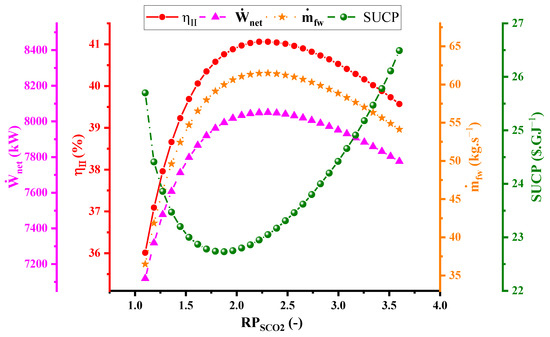 Figure 3 illustrates of the relationships between RPsCO2 and the parameters , , , and SUCP. It is evident that three of these curves, RPsCO2, RPsCO2–, and RPsCO2–, exhibit a closely aligned behavior characterized by an ascent leading to a peak, where all three variables (, , ) attain their maximum values at RPSCO2 = 2.23, followed by a subsequent descent. After the RPsCO2 value reaches its maximum, the turbine continues to produce power, and its value is greater than the consumption in the compressor. However, after passing the maximum value, the compressor’s consumption will exceed the turbine’s production due to the fact that some of the production power is consumed in the reverse osmosis unit. RPsCO2– shows a behavior similar to RPsCO2–. In contrast, the fourth curve (RPsCO2–SUCP) portrays a distinct trend whereby the initial increase in RPsCO2 results in a decrease in SUCP. However, after reaching the lowest point of SUCP at RPsCO2 = 1.88, the trend reverses, leading to a rise in SUCP with further RPsCO2 increases.
