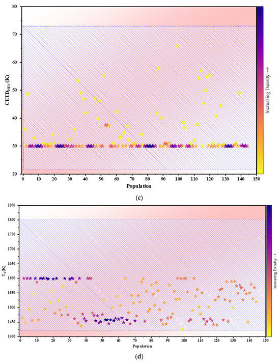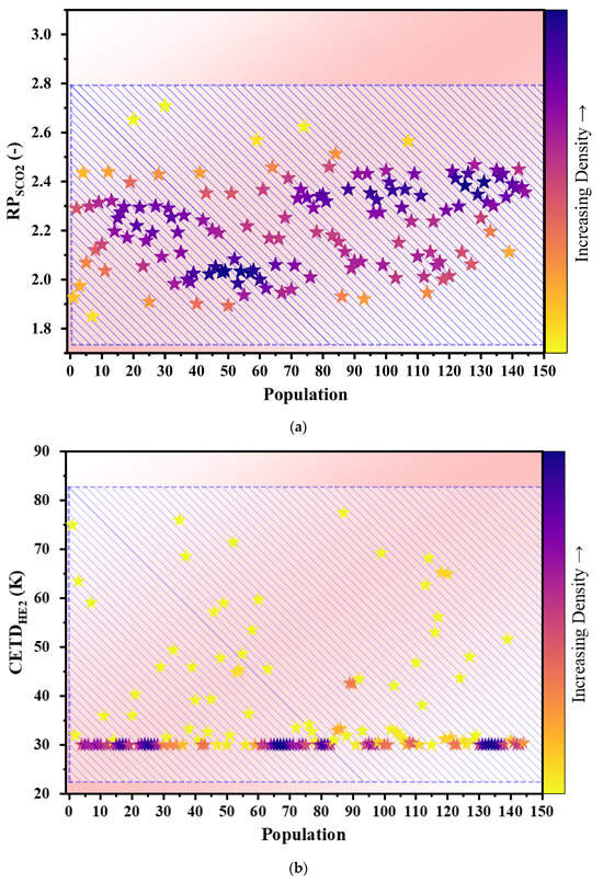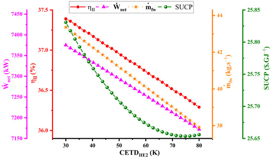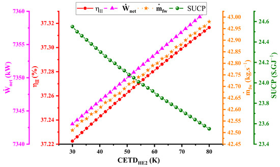 Figure 4 presents data pertaining to the correlation between CETDHE2 and four other variables: Wnet, η, mfw, and SUCP. These variables collectively exhibit a linear variation. Specifically, those associated with , , , and SUCP display positive inclines, with their lowest point observed at CETDHE2 = 30, and the highest point at CETDHE2 = 81. Conversely, the correlation involving SUCP exhibits a negative incline, with its minimum occurring at CETDHE2 = 81 and its maximum at CETDHE2 = 30. As the value of CETDHE2 decreases, the heat transfer increases, leading to an increase in efficiency. With a rise in CETDHE2, the heat exchanger’s structural complexity which is based on its effectiveness in heat transfer decreases, and the device’s cost is reduced.