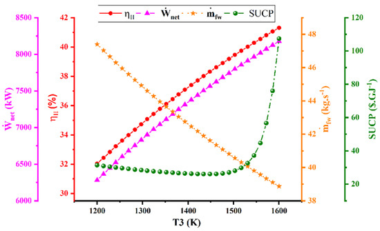 Figure 6 shows the correlations among four variables, SUCP, , , and, , in relation to T3 (temperature), and exhibit a diverse array of behaviors. The graph illustrating the T3 relationship displays a descending trend, progressively declining as T3 increases (based on the energy equation for HE1). Increasing the production power of the turbine decreases the thermal energy in the exhaust gases, resulting in less energy to transfer to other cycles. Considering that the electricity required by the reverse osmosis unit is supplied from the bottom cycles (sCO2 and ORC), the rate of fresh water production decreases because the electricity production decreases. Conversely, the T3 and T3 graphs show an ascending pattern, with values steadily rising as temperature escalates. Finally, the T3–SUCP plot demonstrates a relatively constant state initially, but upon reaching a temperature of 1500 K, it undergoes an abrupt vertical ascent. This sudden increase is a manifestation of the formula used to calculate the turbine’s price; as the turbine works at a higher temperature, it is more complicated and has a higher price.
