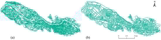 Comparison charts of the minimum research unit before (a) and after (b) functional zone identification.