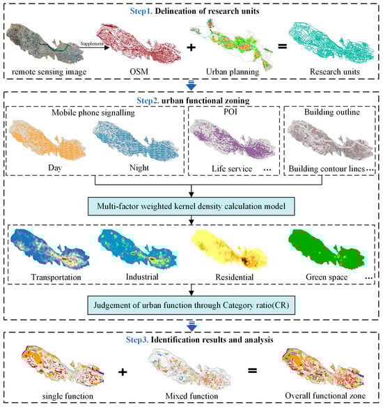 By integrating mobile signaling data, points of interest (POI) data, building outline data, and other supplementary datasets, this study proposed a novel approach for identifying urban functional zones, as illustrated in Figure 3. First, the urban road network was processed in accordance with road topology principles, and additional auxiliary data were used to delineate the smallest parcel units within the urban area. Secondly, the kernel density of each POI category was estimated at the smallest parcel units. These kernel densities were then weighted and superimposed based on three assessment factors: day-time and night-time human activity, land feature area, and public awareness. Again, based on the delineation rules, the functional categories of the smallest parcel units were determined. We then applied the local hotspot analysis method to identify hotspot areas. Finally, accuracy verification was accomplished by confusion matrix method.