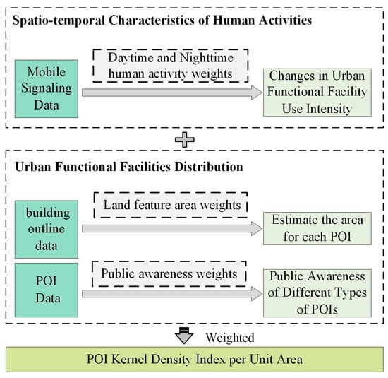 Compared with the traditional estimation method based on frequency density, the kernel density estimation method accounts for the locational influence of the first law of geography, thoroughly considers the spatial autocorrelation of POI data, and weakens the discretization phenomenon of POI data. Because each type of POI exhibits varying levels of demand, scale, and scope of influence, this study proposed a multi-factor weighted kernel density calculation model that integrates ‘human activity–land feature area–public awareness’, as shown in Figure 4.