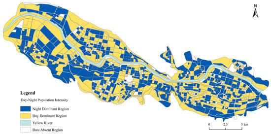 Figure 5 displays the outcomes of day-time and night-time human activity identification, revealing that the number of night dominant regions (553) is 1.2 times more than the number of day dominant regions (458) in the central city of Lanzhou. As demonstrated in Table 4, the daytime activity in the green space zone, which is open only during the day, is far greater than at night, whereas the night-time activity in the commercial and residential zones is far greater than during the day. Variations in day-time and night-time for different functional utilization intensities are influenced by resident travel characteristics and the operating hours of functional service facilities. Hence, it is justified to finely categorize the day-time and night-time activity of distinct functions.