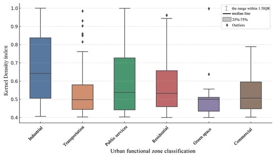 Box plot of multi-factor weighted kernel density indices for different functional zones.