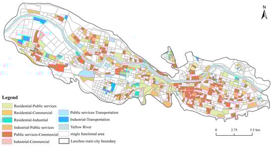 The mixed functional zones cover a relatively small area, comprising only half of the single functional zones, which indicates the relatively low level of functional mixing in the urban area. Thus, the overall functional structure still needs to be upgraded. The mixed functional zones are primarily a combination of public services and commercial zones, and residential and public service zones, which account for 31.95% and 24.39% of the total mixed functional zone (Figure 9). Among them, this combination of public service and commercial zones are mainly distributed in the Chengguan core cluster and the Anning-Qilihe area. In this region, public facilities, such as schools, organizations, and hospitals, are widely distributed, and commercial activities are more developed. The combination of residential and public service zones is mostly located in Chengguan and Qilihe Districts. Public facilities are constructed in accordance with the population size and are frequently mixed with residential functions.