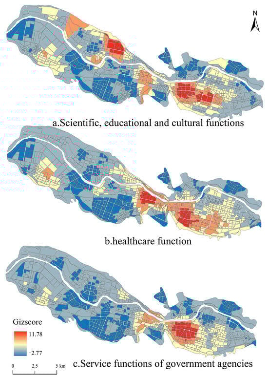 According to the identification results of urban functional zones in Lanzhou City, both the public services zone and the commercial zone, in the form of a single or mixed function, occupy a large proportion of the study area. Therefore, this study utilizes the local hotspot analysis method to identify hotspot areas for multiple secondary subcategory functions within the two types of functional areas, which are characterized by significant clustering differences and are close relevance to residents’ daily lives, as illustrated in Figure 10 and Figure 11.