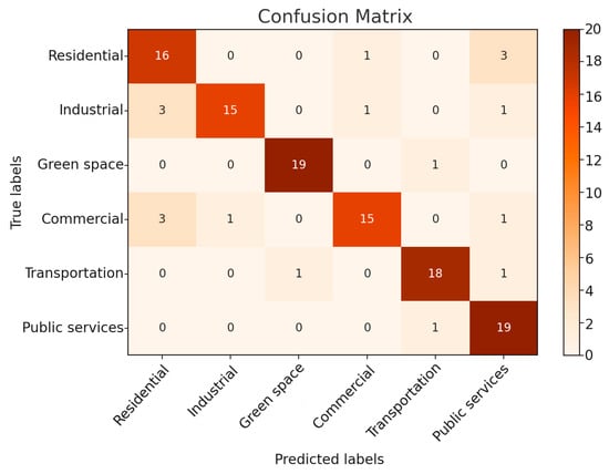 Based on the detailed regulatory planning of Lanzhou central urban area and Baidu Maps, the ground truth of urban functional zones is acquired through manual visual interpretation, with field investigations carried out in areas with uncertain boundaries of the urban functional zones. From the various functional types, excluding mixed functional zones, 20 sample plots were randomly and uniformly selected for each type. In total, 120 sample plots were selected to evaluate the identification accuracy of the urban functional zone. As demonstrated in Table 5 and Figure 12, the overall identification accuracy of the urban functional area in this paper is 85%, with a kappa value of 0.83. In general, high identification accuracy was achieved, confirming the effectiveness of the proposed method.