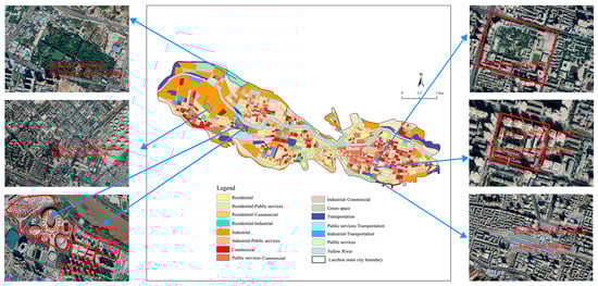Additionally, the identification results were further validated by comparing the findings of this study with GF-2 images and photos from field investigations. The GF-2 image data were acquired from the Gansu Data and Application Center of the High-Resolution Earth Observation System, with a multi-spectral resolution of 1 m. We randomly selected six single-functional and one mixed-functional parcel unit as samples and visually interpreted the GF-2 images of all the samples, as shown in Figure 13. Among them, the parcel units identified as the Green Space Zone are shown as the Renshou Mountain Cultural Tourism Area. The parcel units identified as the industrial zone are shown as Lanzhou Petrochemical Hongda Company. The parcel units identified as the commercial zone are shown as Lanzhou Wanda Plaza and Gansu Dongli Outlets Mall. The parcel units identified as the public services zone are shown as Lanzhou University. The parcel units identified as the residential zone are shown as Baye Residential Community and Gansu Electronics Company Residential Quarters. The parcel units identified as the transportation zone are shown as Lanzhou Station. The parcel units identified as the public services-commercial mixed-function xone, verified through field surveys and GF-2 images, are shown as Lanzhou Olympic Sports Center and Lanzhou Wanda Mall, corresponding with the identification results. These results demonstrate the effectiveness of the methods used in this study.