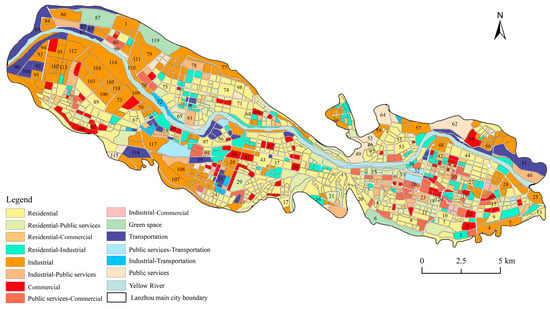 (2) In the central urban area of Lanzhou City, there are a total of 14 functional types, including 6 types of single functional zones and 8 types of mixed functional zones. Overall, a spatial pattern of ‘single–mixed’ synergistic functional development is formed, predominantly composed of single functional zones nested within mixed functional zones. Single functional zones are primarily industrial zones and public services zones; the mixed functional zones are primarily combinations of public services and commercial zones, as well as residential and public service zones; and mixed functional zones comprise only half the area of single functional zones, indicating a relatively low degree of urban functional mixing. City managers should implement spatial planning adjustments to enhance the mix of urban functions by integrating additional public and commercial services near residential zones, to promote the sustainable development of urban resources.