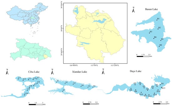Southeast Hubei (113.53°–116.13° E, 29.03°–30.89° N) has a dense network of rivers, and the number of lakes and reservoirs is close to two-thirds of the total number in Hubei Province. This study selected four typical lakes in southeast Hubei: Daye Lake, Cihu Lake, Baoan Lake, and Xiandao Lake. Daye Lake is located in the southeastern part of Daye City, with an area of 64.6 km2 and an average water depth of 1.92 m, and it is classed as an industrial and mining lake [24,25]. Cihu Lake is located in the downtown area of Huangshi City, Hubei Province (30°12′ N, 115°03′ E), with average and maximum depths of 2.7 m and 4.8 m, respectively [26]. Baoan Lake is located in the southern shore area of the middle reaches of the Yangtze River (30°15′ N, 114°43′ E); it has a water area of approximately 45.1 km2 and is mainly surrounded by agricultural land [27]. Xiandao Lake is located in Yangxin County, Huangshi City, Hubei Province (29°47′18″ N, 114°50′07″ E), at the northern foot of Mufu Mountain; it has an average water depth of 25.7 m and a watershed area of 243.00 km2 [28].