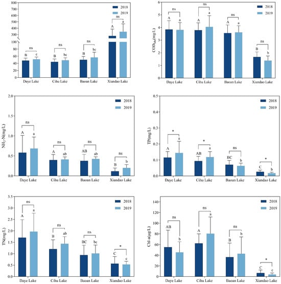 Changes in the environmental characteristic parameters of water bodies in southeastern Hubei. (The error bars in the figure are standard deviations; A, B, and C represent the variability in indicator levels between lakes in 2018, and a, b, and c represent the differences in indicator levels between lakes in 2019; ns and * represents whether the same indicator is significantly different between 2018 and 2019 for the same lake).