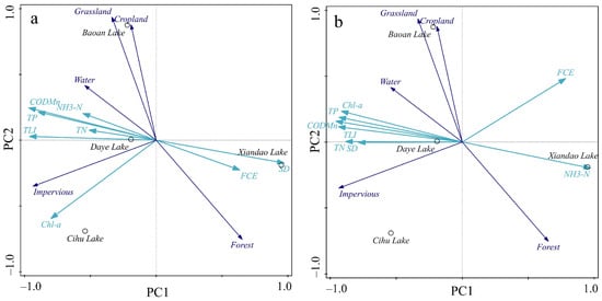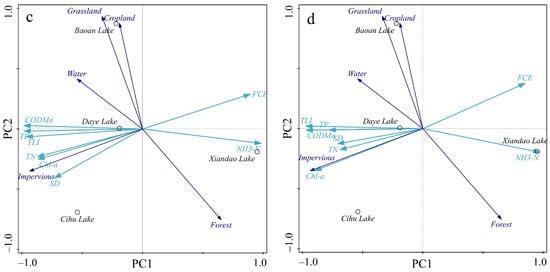 The interaction between land use and seasons also affects the state of the lake’s water environment, and the PCA analysis results show that in spring, Daye Lake and Cihu Lake, which have larger proportions of impervious surfaces, have stronger correlations with CODMn and Chl-a, while the correlations with TP and TN are weaker. In summer and autumn, the correlation between TP and TN and impervious surfaces becomes stronger, but it decreases in winter (Figure 3 and Figure 4). Moreover, TLI values were positively correlated with impervious surfaces and water, while FCE values were positively correlated with forest land in spring in both 2018 and 2019 and positively correlated with cropland and negatively correlated with man-made surfaces in the remaining seasons. The study by Shi et al. also confirms that season, land use status, and water quality are closely related [50]. According to the results of land use classification and the previous analysis, we can see that land use composition (the percentages of various land uses) and landscape configuration (the structure of land use) have a great influence on the water quality and nutrient status level of the lakes in Southeast Hubei [51].