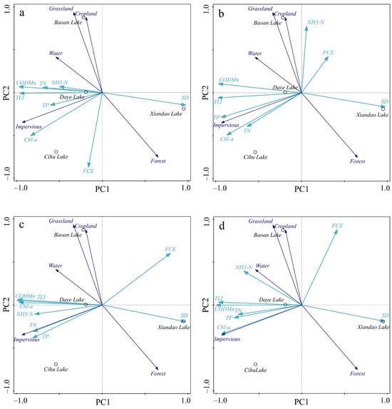 PCA analysis of land use types and water quality indicators for 2018 ((a–d) stand for spring, summer, autumn, and winter).