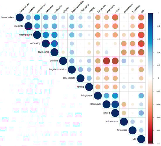 Correlation plot of the analyzed factors considering the whole sample (1346 municipalities included in Italian metropolitan areas).