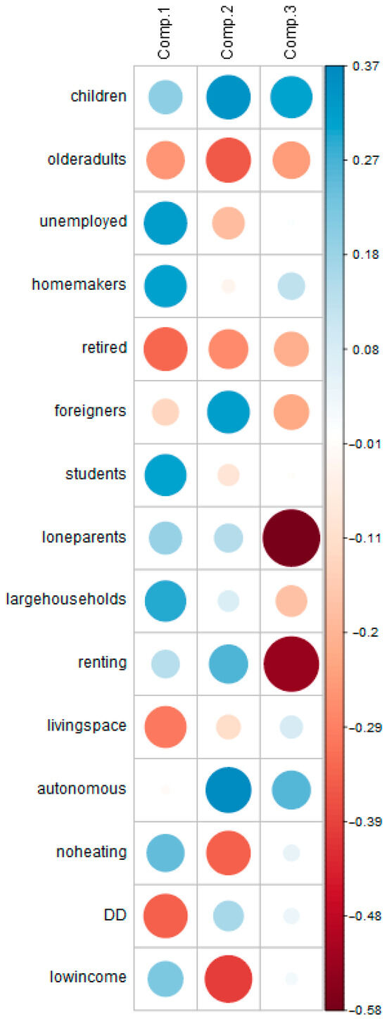 Three components were retained from the PCA analysis (Figure 2), which together explain 60.1% of the variance observed in the dataset. The first component, explaining 29.7% of the variance, highlights the relevance of factors related to employment, such as the percentage of the unemployed jobseekers, the percentage of homemakers, and the percentage of the student population (>15 years old), all with a positive loading on the component (blue dots). On the other hand, the percentage of retired population and correlated factors such as the surface of living space per inhabitant all have a negative loading on the component (red dots). Component one also highlights the relevance of factors such as climate (degree days, with a strong negative loading) and the percentage of households with six or more members (positive loading).