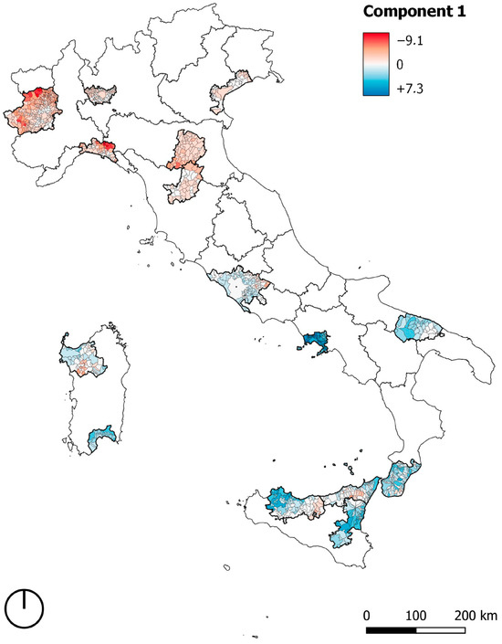 The absolute most relevant factors at the national level are those related to working conditions, which alone explain one-third of the variability between municipalities at the national level. Some trends are not surprising. The first one relates to the north–south divide (component 1), given the Italian situation where the north is known for being wealthier than the south. The second “intuitive” trend is represented by the center–periphery difference (component 3), which reflects usual urban dynamics. Other trends, however, are more unexpected, e.g., the strong peninsula–island divide. Usually, in the Italian context, the socioeconomic behavior of the islands tends to follow that of the south, while in this case, the islands have a different behavior from the peninsula, including its southern part.