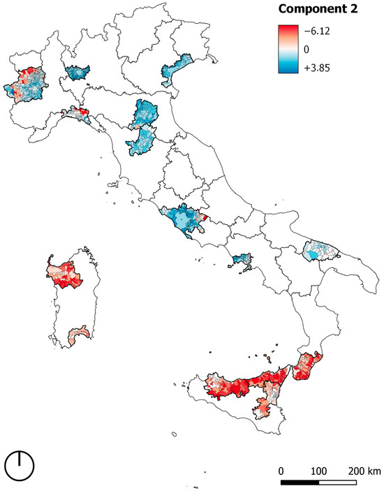 Component 2 (Figure 4), similarly to component 1 (Figure 3), has a behavior that divides the map into two major areas. However, while for component 1 it a matter of north/south divide, for component 2 we can see a “continent/islands” divide. In the peninsular part of Italy, factors with a positive loading on component 2 are the most relevant, including children (percentage of population under 4 years old), foreigners (percentage of foreign population), and the type of heating system (percentage of homes with independent heating). In the islands and in the metropolitan area of Reggio Calabria, in the extreme south of the peninsula close to Sicily, the relevant factors (with a negative loading on the component) are the elderly (percentage of population over 75 years), the lack of heating systems (percentage of dwellings without heating), and income (percentage of taxpayers with an income up to EUR 10,000).