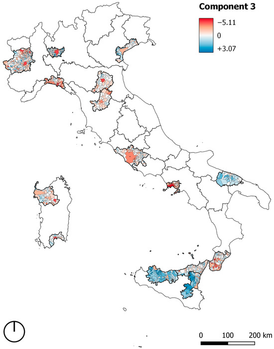 Component 3 (Figure 5) shows variations at a finer scale within each metropolitan area. Although it is difficult to identify common patterns, metropolitan centers stand out in many cases for being characterized by more negative values of component 3 compared to their surroundings (e.g., Naples, Milan, Bologna). This indicates that the vulnerability to energy poverty in the main cities tends to be related to those factors that have a negative loading on component 3, i.e., percentage of single-parent households and percentage of households living in rented accommodations. Overall, these have a much stronger influence than the factors characterized by a direct correlation (percentage of population under 4 and percentage of homes with independent heating).