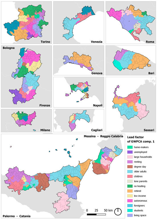 Reading the three maps (Figure 3, Figure 4 and Figure 5) with this lens, we can deduce from Figure 3 that component 1 divides the map into two main areas: north and south. Metropolitan areas of central–northern Italy are characterized by the relevance of factors with a negative loading on component 1, among which are the presence of retired people, the surface area of dwellings, and the degree days. In Southern Italy, the most relevant factors (positive loading) are unemployment (percentage of population looking for job), percentage of homemaker’s population, and household size (percentage of households with six or more members).