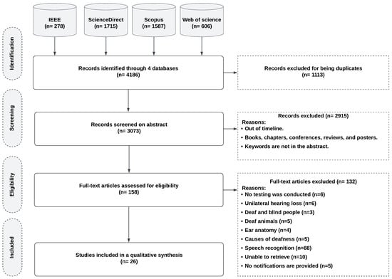 To retrieve studies that are relevant to the current study, the following nine keywords have been picked: “sound detection”, “sound uncover”, “sound reveal”, “sound alert”, “sound alarm”, “deaf”, “hard of hearing”,” impaired of hearing”, and “hearing loss”. To obtain the final formula of the query, in the beginning, appropriate keywords have been set up and linked using “AND”, for instance, “sound detection” AND “deaf”.