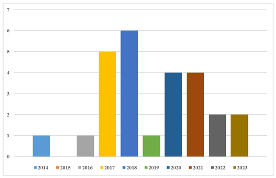 The SLR covered a period between 2014 and 2023. Four research databases, including IEEE, ScienceDirect, Scopus, and Web of Science, were used to retrieve journal papers relevant to the current study. Figure 1 depicts the SLR selection procedure. Figure 2 illustrates the ratings of the included papers based on their year of publication, with 2018 having the highest number of papers and 2015 having no papers.