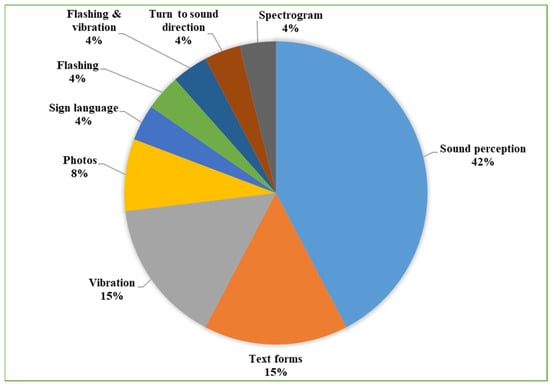 Interpreting sound events for DHI individuals involves converting auditory information into visual, vibrational, or aural information. Often, DHI individuals prefer visual methods to understand the information of sound, such as sign language, text, spectrograms, photos, and flashing in different colors. Vibration can also expose the meaning of sound to the deaf by providing convenient vibration. Moreover, interpreting sound or voice can be aurally special for hearing-impaired individuals by correcting their hearing senses by using CIs [47] or by improving their hearing sense with a hearing aid [48]. Figure 3 illustrates the various methods that were employed in each research to interpret sound events for DHI people. The method of revealing sound events through the ears was used in 42% of articles [22,29,33,34,35,36,37,41,43,44,45]. Text form was used in 15% of articles [4,21,32,39]. Vibration was implemented in 15% of articles [25,26,27,42]. Photos were implemented in 8% of articles [24,40]. Sign language was applied in 4% of articles to elucidate sound events [38]. Flashing was implemented in 4% of articles [23]. Flashing and vibration were carried out in 4% of articles [30]. Turn-to-sound direction was used in 4% of articles [28]. Spectrogram was utilized in 4% of articles [31].