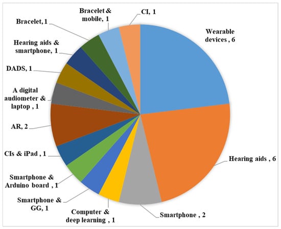 Involving DHI individuals in community daily life activities has become a concern of Ats, to facilitate immersion in society, meet needs, and maintain privacy. Also, ATs play a role in enhancing auditory perceptions [49]. ATs comprise a wide scope of assistive, rehabilitative, and adaptive gadgets for individuals with exceptional needs [50]. Ats’ solutions have multiple forms; the most famous forms are implants, portables, and wearables, which have gained significant interest recently. These assistive technologies are essential for sustainable sound detection, by increasing sound detection systems’ accuracy, speeding up detection and alerting times, and improving user interfaces to make the technology more approachable and accessible. DHI people can benefit from ATs, each with specific advantages. The ideal option frequently varies depending on the person’s lifestyle, interests, and degree of hearing loss. Hearing aids, which simply amplify sound and are equipped with a noise suppression system, are used to treat hearing loss [51]. AR is an interactive technology that imitates the real world by using digital environmental [52]. Cochlear implants use a sound processor that sits behind the ear, picks up sounds, and sends sound signals to a transmitter located deep under the skin. The transmitter sends the sound via a wire that carries tiny electrodes attached to the inside of the ear [53]. Many included studies relied on artificial intelligence (AI) tools to provide ATs with intelligent, adaptive, and intuitive solutions that improve accessibility. Among these tools is ML, which focuses on creating statistical models and algorithms that let computers carry out tasks without direct human guidance [54]. ML algorithms gain knowledge from big data and then produce prognoses or make decisions by applying statistical analysis and leveraging patterns. ML is used to classify sound by examining data patterns that point to specific circumstances. These can be created and gathered from a variety of sources, including datasets and recorded sound. Several algorithms are employed for this, such as unsupervised learning algorithms that can find patterns in data without the requirement for explicit labels and supervised learning algorithms that are trained on labeled data. Following model training on the gathered dataset, the model can be used to predict specific sound events, based on data. To achieve this prediction, machine-learning researchers apply newly learned patterns to fresh data and use the output of the models to diagnose conditions. Deep learning is a branch of machine learning centered on multi-layered neural networks to analyze data and draw conclusions from large-scale databases that are efficient at tasks like audio processing, image identification, and natural language processing [55]. Deep learning uses representations derived from human brain knowledge to learn from unstructured or unlabeled data [56]. Using a deep learning approach is a big step towards creating automated systems that can identify hazardous situations, increase public safety, and improve the quality of life of DHI individuals [57]. Figure 4 demonstrates the different assistive technologies used in each study. The reviewed articles revealed the use of wearable devices in six articles [25,26,27,28,30,32]. Hearing aids were implemented in six articles [33,35,36,41,43,44]. The examined articles indicated the utilization of smartphones in two studies [29,38]. The reviewed articles revealed the use of computer and deep learning in one article [23]. The reviewed articles stated the use of smartphone and GG in one article [4]. One of the included studies implemented a smartphone and an Arduino board [21]. The review reported the utilization of CIs and iPad in one article [37]. AR technology has been used in two studies [31,42]. A digital audiometer and laptop were used in one retrieved study [22]. The review encompassed an article that used DADS [24]. One article among those reviewed displayed the utilization of hearing aids and smartphone [34]. The reviewed articles indicated the use of a bracelet in one article [39]. One article within the review mentioned the utilization of bracelets and smartphones [40]. The review reported the utilization of CIs in one study [45].