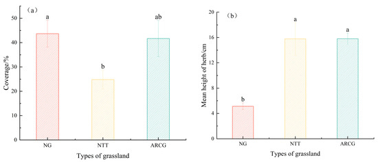 Vegetation coverage (a) and mean height (b) of different types of grasslands. Note: Different lowercase letters indicate significant differences between different types of grasslands at the 0.05 level. NG, natural grassland; NTT, natural turf transplantation; ARCG, artificial replanting of cash crop grassland; this is applicable for the following figures as well.