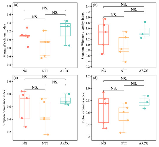 Figure 3 illustrates the box plots for significant differences in the vegetation diversity indices among the original grassland, natural turf-replanted grassland, and replanted economic vegetation grassland. The results indicate no significant differences between the original grassland and the restored natural turf-transplanted and economic vegetation grasslands, suggesting effective restoration of vegetation diversity in the restored areas. However, the Margalef richness index, Shannon–Wiener diversity index, Simpson community dominance index, and Pielou evenness index were all higher in ARCG than natural turf-transplanted grassland, resulting in the order ARCG > NG > NTT. This demonstrates that the restoration effect of economic vegetation replanting measures was significantly more successful than that of natural turf transplantation.