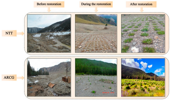 This study evaluated ecological restoration efforts implemented at an abandoned mining site in the Altai Mountains. By comparing NTT and ARCG, we assessed the effectiveness of these restoration methods using key environmental indicators such as vegetation cover, species diversity, SWC, and SOC. The results demonstrated that both NTT and ARCG significantly improved ecological conditions, with ARCG showing the greatest success in enhancing vegetation cover and soil quality.