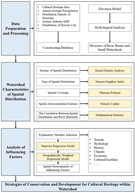 The research process was structured into four parts: a. data preparation and processing; b. analysis of the watershed characteristics in the spatial distribution of cultural heritage; c. analysis of influencing factors; and d. cluster preservation and development strategies of watershed cultural heritage. Initially, the data were collected to construct a comprehensive database, including DEM data, cultural heritage resource location, slope, cultural heritage coordinates, temperature and rainfall for different regions in Henan Province, cultural industry GDP, and museum coordinates. Based on DEM data, GIS hydrological analysis tools were used to divide Henan Province into seven major watersheds and multiple small watersheds. Second, the spatial distribution characteristics of cultural heritage within the river basins were examined. The kernel density estimation method was employed to analyze the spatial distribution density of cultural heritage across each basin. The nearest neighbor index was utilized to assess the types of spatial distribution (including clustered, random, and uniform) within each basin. Moran’s I was applied to evaluate the spatial auto-correlation of cultural heritage in each basin, while the Thiessen polygon method was used to determine the service areas of cultural heritage sites within each basin. Additionally, a GIS spatial statistical analysis was performed to investigate the relationship between different basin levels and the distribution of cultural heritage. Then, a stepwise regression model was applied to identify the optimal influencing factors, which was followed by the application of a geographically weighted regression (GWR) model to examine the spatial heterogeneity of these factors. Finally, based on the research findings, strategies and recommendations were proposed for the sustainable spatial conservation and utilization of cultural heritage in Henan Province (Figure 3).
