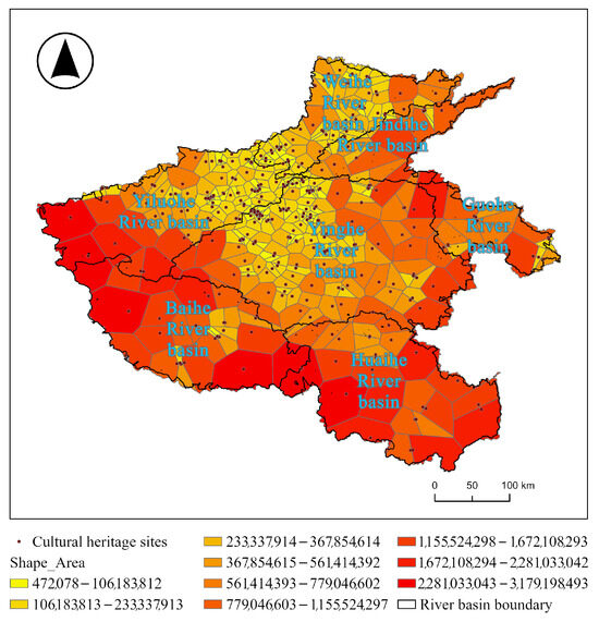 This study constructed the Voronoi diagram of Henan Province’s tangible cultural heritage resources. The area of each Thiessen polygon reflects the service range of each cultural heritage site. The larger Thiessen polygon area indicates that the cultural heritage resources in that region are scarcer.