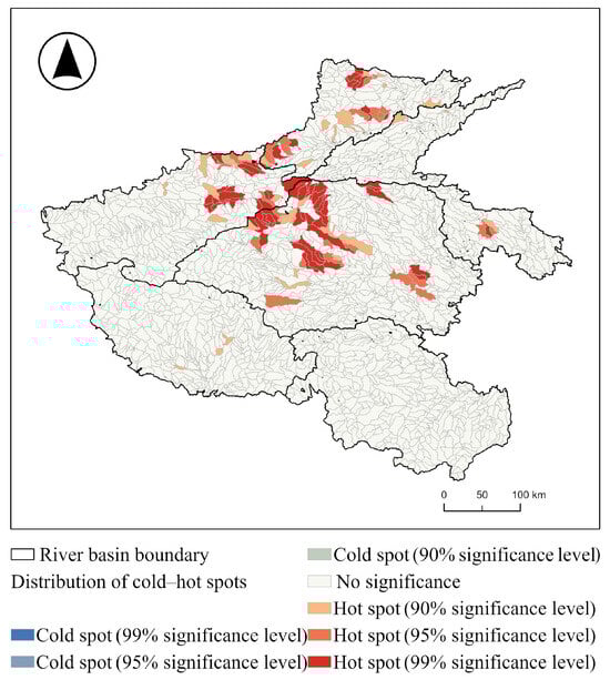 However, global spatial auto-correlation cannot capture the correlations between specific small river basins. It is often combined with a local spatial auto-correlation analysis to further examine correlations among small regions. In this research, hot spot analysis is employed to further investigate the spatial auto-correlation characteristics among small river basins, aiming to analyze the distribution features of clustering and dispersal areas. Hot spots refer to areas with high data values, meaning the observed values in these areas are significantly higher than those in surrounding regions. Cold spots refer to areas with low data values, indicating that the observed values are significantly lower compared to surrounding areas [49,50]. The calculation formula is as follows: