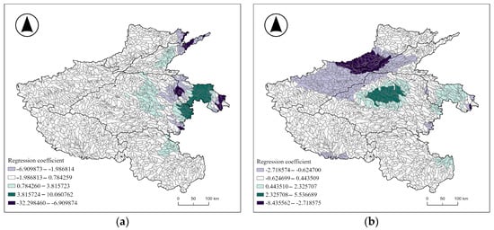 This study employed a geographically weighted regression (GWR) model to analyze the spatial variations of influencing factors across different basins. The dependent variable was the number of cultural heritage sites in each sub-basin, while the explanatory variables included average elevation, annual precipitation, tertiary industry GDP, museum density, and the distance to the nearest historic city. The results reveal considerable differences in the impact of these factors across various basins, indicating significant spatial heterogeneity (Figure 8).