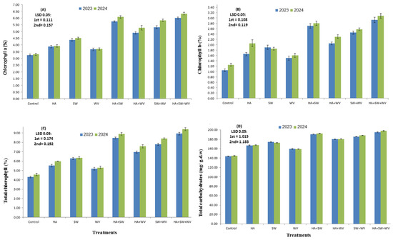 The impact of humic acid (HA), seaweed extract (SW), and wood vinegar (WV) applied to leaf chlorophyll (chlorophyll a (A), chlorophyll b (B), total chlorophyll (C), and total carbohydrate (D) content of Ewais mango trees assessed for the 2023 and 2024 seasons. Data are presented as means ± SE.