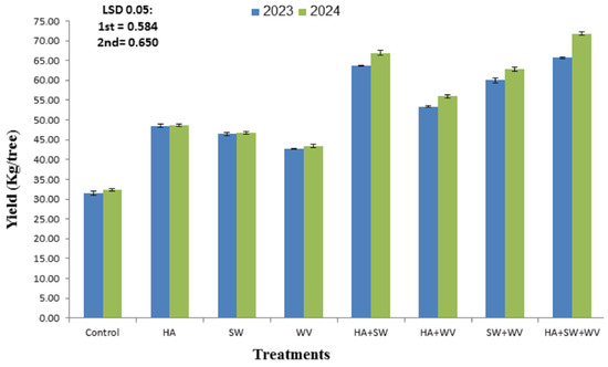 The data listed in Figure 2 demonstrated that all tested treatments significantly increased the yield (kg/tree) as compared with the control in the 2023 and 2024 seasons. Briefly, the fruits treated with HA along with SW and WV scored almost 2.1 and 2.2 times higher than that of the control, producing the highest yield (65.72 and 71.79 kg/tree in 2023 and 2024 seasons, respectively), followed by treatment with HA and SW in both seasons. However, the control trees exhibited the lowest yield weight (31.49 and 32.35 kg/tree) in the 2023 and 2024 seasons, respectively.