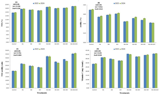 Effect of applying humic acid (HA), seaweed extract (SW), and wood vinegar (WV) to soil on TSS (A), acidity (B), TSS/acidity ratio (C), and vitamin C (D) of Ewais mango trees in the 2023 and 2024 seasons.