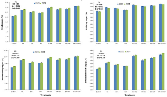 Effect of applying humic acid (HA), seaweed extract (SW), and wood vinegar (WV) to soil on total sugar (A), reducing sugar (B), non-reducing sugar (C), and total carotenoids (D) of Ewais mango trees in the 2023 and 2024 seasons.