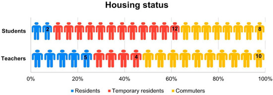 | Housing status | Among the students, there is a prevalence of non-resident living in Alghero (54.5%) compared to commuters, while among the teachers, there is a prevalence of commuters (52.6%). Conversely, among the teachers, there is a higher percentage of residents compared to the students (26.3% vs. 9.1%). |