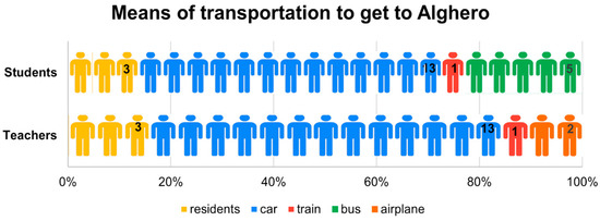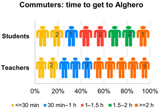 The majority of students took less than 1.5 h to reach Alghero, with only about 12% facing journeys longer than two hours. Among the professors, half took over two hours to travel, while the other half took less than an hour (Figure 3).