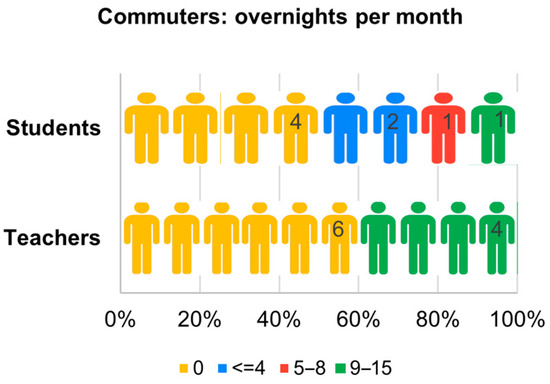 Half of the commuter students never spent a night in the city, while the other half, collectively, stayed for a maximum of 15 nights per month at most. Among commuter professors, on the other hand, 60% never stayed overnight in the city, while 40% chose to stay between 9 and 15 nights (Figure 4).